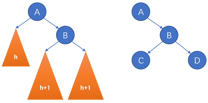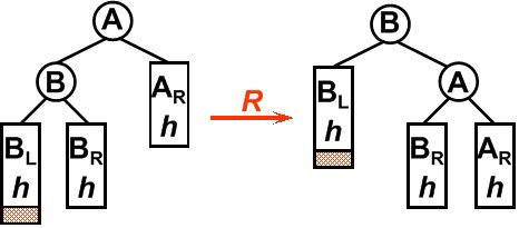 最后实现“调整\(x_i\)子树的内部结构使其成为AVL树”的步骤。设上述迭代过程在第\(k\)轮首次遇到当前节点\(x_{k}\)不是AVL树的情况,首先若这种情况不存在,则整个迭代结束时,整个二叉树显然是AVL树。根据上述迭代框架,该轮迭代开始时\(x_{k}\)的左右子树都是AVL树并且其中\(x\)所在子树的高度和BST插入前不同,由于该轮迭代前的迭代过程不改变二叉树结构且\(x\)的加入只能使其祖先高度不变或+1,故此时\(x\)所在子树的高度等于BST插入前该子树的高度+1,且\(x_{k}\)不是AVL树只能因为其左右子树高度差大于1,那么\(x_{k}\)的左右子树高度差只能由BST插入前的1变为2,而这又使\(x_{k}\)的高度相比BST插入前+1。显然此时符合执行\(rotate(x_{k})\)的前提,根据\(rotate\)的步骤执行后原\(x_{k}\)子树成为AVL树且高度相比BST插入前不变或+1,根据上述迭代框架,若高度不变则可退出迭代,而高度+1的情况并不会出现,该情况说明\(rotate\)执行前\(x_k\)如上图的A节点(\(b=0\)的\(rotate\)),图中三角表示子树并标注了高度,由于B只有1个子树受BST插入影响,故BST插入前B的高度与此时相同,这说明A在BST插入前已不是AVL树,导致矛盾。结合上述讨论,整个迭代过程可在每轮迭代都检查\(x_i\)是否是AVL树,若\(x_i\)是AVL树且高度和BST插入前相同则退出迭代,若\(x_i\)是AVL树且高度和BST插入前不同则退出迭代,若\(x_i\)不是AVL树则执行\(rotate(x_i)\)后退出迭代。并且该迭代过程在每轮迭代开始时当前节点\(x_i\)的左右子树都是AVL树且其中\(x\)所在子树的高度等于BST插入前+1。最后根据上述迭代框架,每轮迭代开始时\(x_i\)是AVL树的充要条件是\(x_i\)的左右子树高度差小于2,故该迭代过程与上述\(insert\)步骤等价。