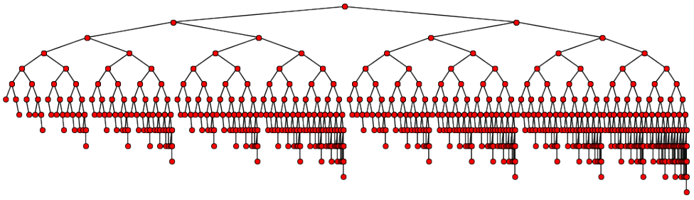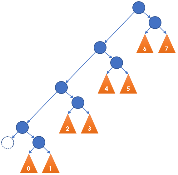 首先注意到\(remove\)最坏需执行二叉树高度\(O(h)\)次\(rotate\),而\(insert\)至多执行1次\(rotate\)。上图是最坏情况的例子,其中虚线节点是BST删除去掉的节点,该节点原本的所有祖先都会被执行\(rotate\),这使得AVL树的删除性能不如一些其他的自平衡二叉树。然后讨论上述步骤是如何构造的。首先若\(x_1…x_n\)为空,则BST删除后整个二叉树是空树或原二叉树中的某个子树,显然符合AVL树定义,故之后认为\(x_1…x_n\)非空。然后考虑通过一种迭代\(x_1…x_n\)的过程来使整个二叉树成为AVL树,要求每轮迭代都检查\(x_i\)子树是否是AVL树,若不是则调整\(x_i\)子树的内部结构使其成为AVL树(子树根可能不再是\(x_i\))。注意在BST删除完成时\(x_1\)的左右子树都是AVL树(包括空树),因为两者是空树或原二叉树中的某个子树,于是这个迭代过程不仅能保证整个二叉树是AVL树,还能保证每轮迭代开始时当前节点\(x_i\)的左右子树都是AVL树,可利用这一点构造迭代步骤本身。