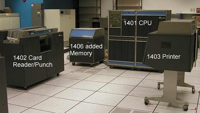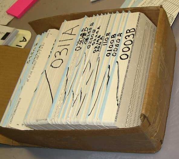 3) 4层计算机系统:早期的程序员如果想在计算机上执行任务,需要先跟计算中心(见上图)预约时间段,然后带上以打孔卡片为介质的程序(见上图)去计算中心排队,程序员在使用计算机时必须手动切换各种打孔卡片来完成编译、执行等各种步骤。为避免排队和切换卡片等麻烦,1960年左右的计算机中出现了一种常驻程序,其能够让计算机一次性装入多个任务并依次完成每个任务,不过这需要定义一些特殊的打孔卡片,用于标注每个任务的类型、每个任务的开始结束位置(整排卡片中的开始结束位置)等等。上述常驻程序就是最早的操作系统,新定义的特殊卡片就是操作系统层的新指令;