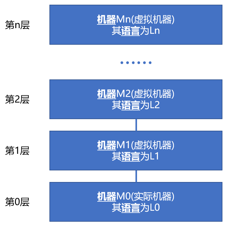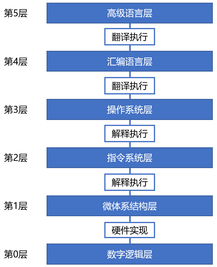 4) 操作系统层:基于下一层的指令构造软件解释器。更具体来说,该层的大部分指令通常跟下一层相同,仅有小部分新指令,新指令会被解释执行为下一层的指令,其他指令会被交给下一层执行。该解释器就是一般意义下的操作系统;