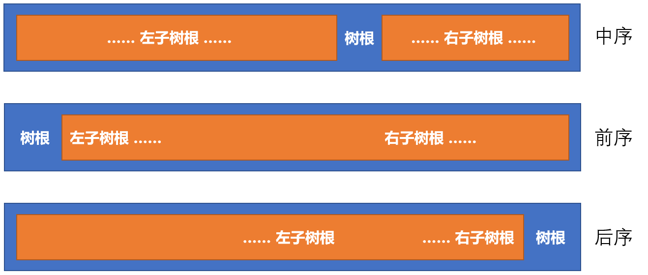 2.2) 若前序序列第2个元素不是后序序列倒数第2个元素:前序序列第2个元素是左子树的树根,后序序列倒数第2个元素是右子树的树根。利用这2个树根和这2种序列的特征,可以划分1对“左子树的前序序列”和“左子树的后序序列”、1对“右子树的前序序列”和“右子树的后序序列”,最后对这2对“前序和后序序列”递归;