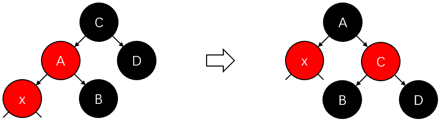2.3.2) \(x\)与其父亲都是右节点:置\(x\)的父亲、祖父为黑、红。左旋转\(x\)的祖父。退出迭代(参考上图第2张);
