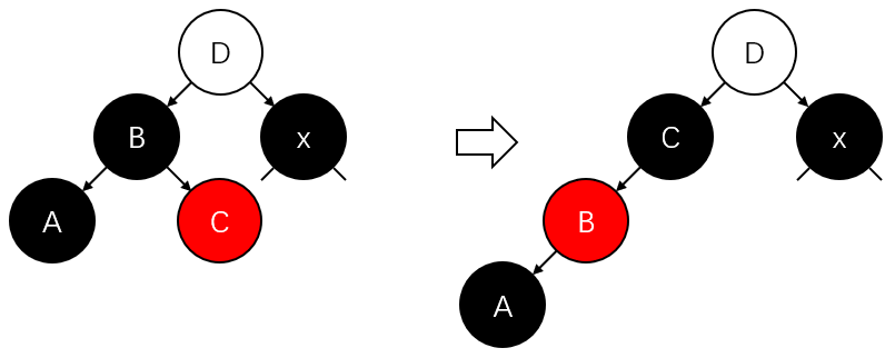 2.3.4) \(x\)与其父亲分别是左右节点:右旋转\(x\)的父亲(参考上图第3张)。置\(x\)为旋转前\(x\)的父亲。照搬(2.3.2);