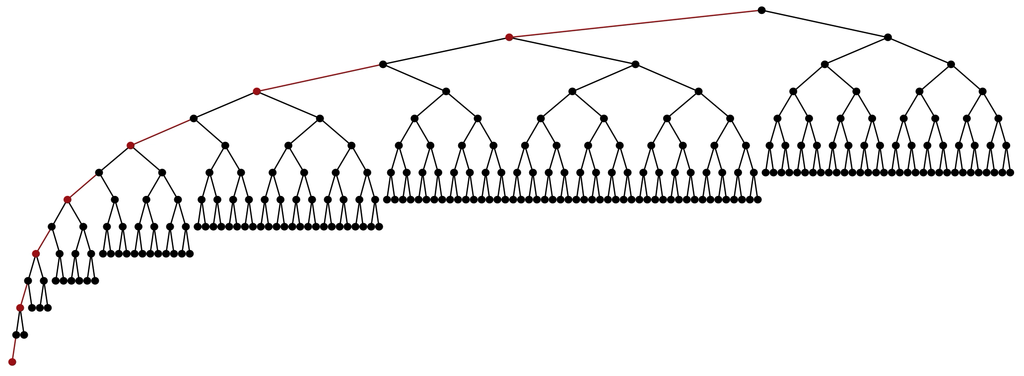 证明:设\(N_{bh}\)是黑高\(bh\geq 0\)的松弛红黑树所需的最小节点数。则\(N_0=0\)。由\(N_{bh}\)的定义容易用反证法验证\(N\)严格单调递增。设松弛红黑树\(T\)的黑高为\(bh>0\),节点数为\(N_{bh}\)。假设\(T\)有红树根,则\(T\)左子树右子树的黑高都为\(bh\)且节点数都必须为\(N_{bh}\),与\(N\)严格单调递增矛盾,所以\(T\)一定有黑树根,故\(T\)左子树右子树的黑高都为\(bh-1\)且节点数必须都为\(N_{bh-1}\),于是可得递推式\(N_{bh}=2N_{bh-1}+1\),设\(S_{bh}=N_{bh}+1\)以去掉常数,则\(S_{bh}=2S_{bh-1}\),求等比数列得\(S_{bh}=2^{bh}\),故\(N_{bh}=2^{bh}-1\)。所以黑高为\(bh\)的含最少节点的松弛红黑树是仅含黑节点且高度为\(bh\)的完美二叉树。继续取对数可得到\(bh=\log_2{(N_{bh}+1)}\),然后设包含\(n\geq 0\)个节点的松弛红黑树的最大黑高和最大高度分别为\(BH(n),H(n)\)。根据\(N,BH\)的定义有\(N_{BH(n)}\leq n\),带入上述等式有\(BH(n)=\log_2{(N_{BH(n)}+1)}\leq \log_2{(n+1)}\)。根据松弛红黑树的定义有\(H(n)\leq 2BH(n)=2\log_2{(n+1)}\),最后根据性质(a2)该式对红黑树成立。为确定该界足够准确,考虑构造高度为黑高2倍的红黑树,上图实际上就提供了构造方法,即对于任意黑高\(k\geq 1\),先构造树根为黑且红黑相间的由\(2k\)个节点组成的“左链表树”,并从左到右依次在每个节点的空右孩子接入高度为\(0,0,1,1,…,k-1,k-1\)的仅含黑节点的完美二叉树,显然其节点数\(n=2\Sigma_{i=0}^{k-1} (2^i-1) + 2k=2^{k+1}-2\),取对数可得高度\(2k\)等于\(2\log_2{(n+2)} – 2\),所以该方式构造的树在\(n\)无穷时与\(2\log_2{(n+1)}\)的比值为1,故该界准确。