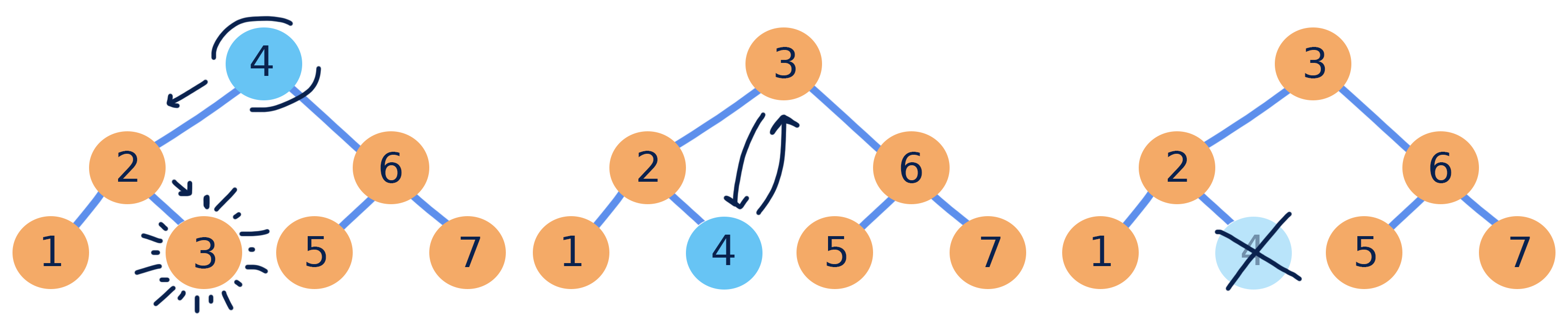另外需注意(3.3)情况,虽然其符合上述BST运算的定义,但其并未真正删掉“应该被删掉的\(x\)”,这在一定程度上会让人费解。从直觉上来说,任何节点在从创建到删除的过程中\(key\)都更应该保持不变,在具体使用BST时若不注意到这点可能会造成一些具体的问题。不过想要“真正删掉\(x\)”并不复杂,只需在原步骤上做修改,使\(y\)在被取下后不去执行替换\(key\)的步骤,而是直接用\(y\)来取代\(x\)的位置,大致步骤是先让\(y\)的3个指针和\(x\)一致,然后找到这3个指针指向的节点,把它们原本指向\(x\)的指针指向\(y\)。最后考虑到(3.3)中的步骤更方便之后讨论其他基于BST的结构,所以这里仍维持(3.3)的步骤不变。
