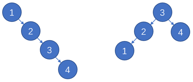 设某个二叉树的节点数和高度分别为\(n,h\),根据之前对二叉树性质的讨论有\(\lfloor\log_2n\rfloor + 1 \leq h \leq n\)。上图的链表形态和完全二叉树形态能分别取到最大和最小高度。由于上述运算的代价为\(O(h)\),所以自然希望每次执行运算前BST是完全二叉树。实际上完全二叉树的要求过于的“强”且不好实现,放宽要求也能达到同样的效果,下面不妨展开讨论这个问题。