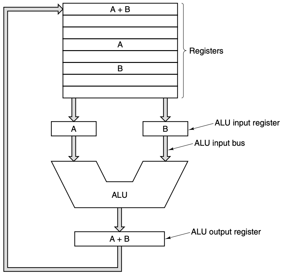 对于现代计算机系统中的CPU,冯·诺依曼结构中的控制单元通常由相对独立的模块实现,之后也称该模块为控制单元。控制单元在执行指令时可通过发出控制信号建立数据通路(data path),数据通路能够完成数据的处理和计算。上图是建立数据通路执行加法运算的例子,控制信号能从固定的一组寄存器中选择2个寄存器作为ALU的2个输入数据、选择1个寄存器用于存放ALU的输出数据,并控制ALU执行加法运算。可认为上图这种承载各种数据通路的模块对应于冯·诺依曼结构中的处理单元,需要注意的是人们也经常将该模块本身称为数据通路,这时数据通路就基本等同于冯·诺依曼结构中的处理单元。