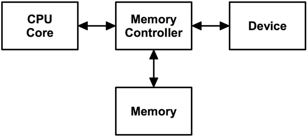2) 内存:配合内存控制器(memory controller)实现冯·诺依曼结构中的内存。内存具备存储能力,其通过内存总线直连内存控制器,再由内存控制器统一处理按内存地址读写的请求。通常将内存和内存控制器统称为内存系统(memory system)。内存可被看作独立的硬件实体,内存控制器则通常是集成在其他硬件中的集成型内存控制器(IMC);