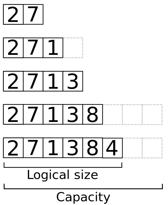 数组在创建时即确定容量上限,创建时不限容量不现实,因为内存是“稀缺”的,而且容量用完时想在数组后继续追加连续内存也不现实,因为后面的内存可能已被占用。所以这时一般的方法是创建更大的数组,再把原来的元素移过去,这将产生\(O(n)\)的代价。相应的如果当前数组很大但元素数很少,为节约连续内存,可创建更小的数组并移动元素。